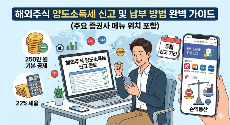 직장 생활의 고단함을 달래줄 파이프라인 구축을 위해 밤낮없이 고군분투하시는 분들이 많습니다. 특히 글로벌 자본 시장으로 캐리어를 끌고 나간 서학개미 여러분, 지난 한 해 동안 미국 주식으로 만족스러운 수익을 올리셨습니까? 수익의 기쁨도 잠시, 매년 5월이 다가오면 어김없이 찾아오는 불청객이 하나 있습니다. 바로 해외주식 양도소득세입니다. 오늘은 바쁜 직장인 투자자들을 위해 세금 폭탄을 피하고 스마트하게 양도세를 납부하는 방법부터 주요 증권사별 신고 메뉴 위치까지 한 번에 정리해 드립니다.