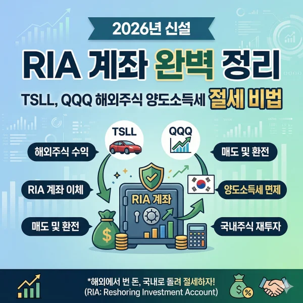 2026년 신설된 RIA(국내시장복귀계좌)는 작년까지 보유한 해외주식(TSLL, QQQ 등)을 매도 후 1년간 국내 주식에 재투자하면 최대 5천만 원 한도 내에서 22%의 양도소득세를 면제해 주는 파격적인 절세 계좌입니다. 단, 1년 의무 유지 조건과 추가 해외주식 매수 시 혜택 축소 규정을 반드시 확인해야 합니다.
